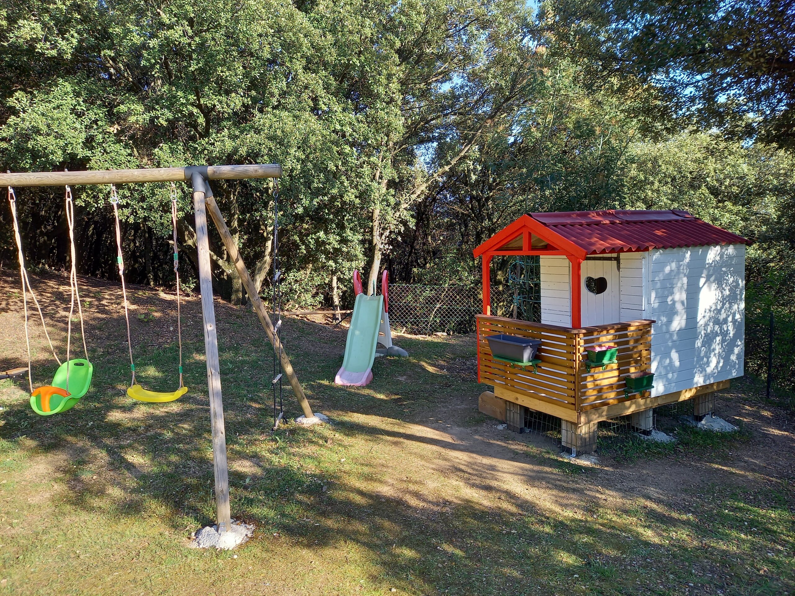 Nous l’avons équipé d’une cabane en bois à leur taille, d’un tobogan, d’un trampoline, d’une balançoire classique et d’une balançoire nid d’oiseau.